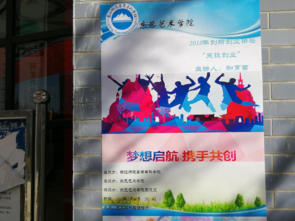 为切实做好我校学生就业工作,积极响应中央关于“大众创业、万众创新”号召,2018年3月18日晚,丽江师范高等专科学校2018年创新创业讲坛首场讲座《笑谈创业》在艺术楼演播厅举行,由丽江市喜鹤民俗文化有限公司总经理和育苗女士进行了创新创业专题讲座。此次活动由我校主办,东巴艺术学院承办,东巴艺术学院团总支学生会协办。