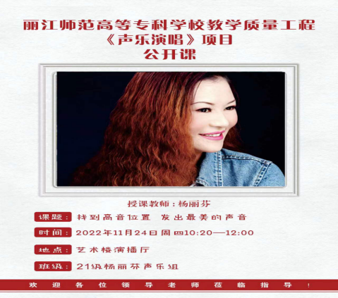 2022年11月24日10:20-12:00艺术学院杨丽芬老师在艺术楼演播厅举行公开课。本次公开参与听课评课的有学校督导组冯丽莎教授、张莉萍教师、刘燕副教授。外聘专家沙马果果老师和全体声乐组教师。本次公开课的授课内容:找到高位置,发出最美的声音。授课班级21级杨丽芬声乐组。