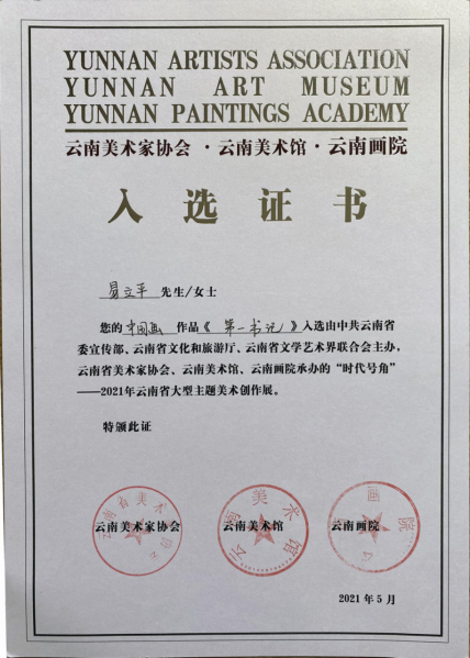 由易立平、陈金国创作的中国画作品《第一书记》入选由云南省委宣传部、云南省文化和旅游厅、云南省文学艺术界联合会主办,云南省美术家协会、云南美术馆、云南画院承办的“时代号角”---2021年云南省大型主题美术创作展。